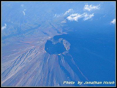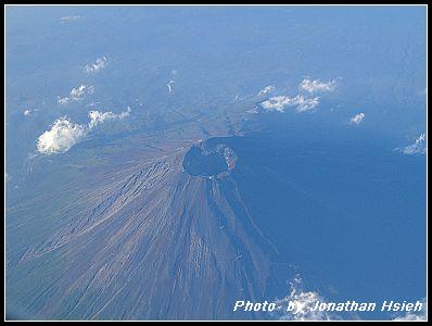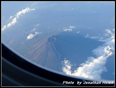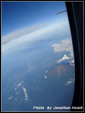 這班從舊金山前往首爾的新航波音777-300ER班機大約只有八成的旅客搭機前一晚先在網路上選好座位最後倒數第二排靠窗的位置飛機滑行後才發現我可以一個人佔用三個位置不過是日間的班機 也沒什麼睡意由於預定的班機要先飛往首爾在飛越太平洋後所抵達的第一塊陸地是日本看著飛航圖 會經過東京的上空但是是從東京灣的南方劃過這時便想會不會經過富士山呢遠遠地看見東京的新宿高樓群不一會從富士山的上方飛過大概很少有機會可以看見這種角度的富士山很完整的一個圓錐 但沒有積雪
