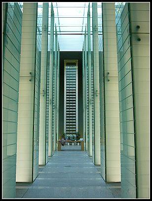 由雙排 12 根向天空伸展的磨砂綠,白色玻璃光柱,構成儀式性的空間,